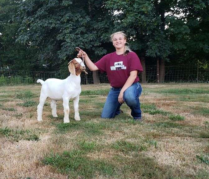 Hi, my name is Mia Achziger im 14 and an intermediate in the udderly Goatesque 4-H club this is my 8th year in 4-H and my 7th year doing market. I am from La Center, Washington and my goats name is Tater Tot. Tater Tot is a fullblood Boer and he weighs 80 lbs and is lot #100.